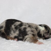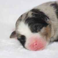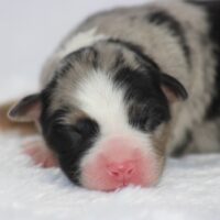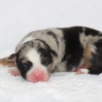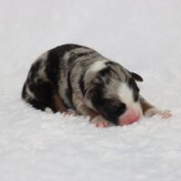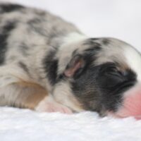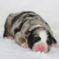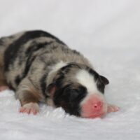 Introducing our biggest litter ever born in 17 years…..WOW is all we can say! 14 puppies. The litter is themes “the new year” . Meet December! This boy is staying here at Canyon Creek for our program because these are just really good genetics and great tempered dogs. Betty had 14 puppies but one was still born. So 13 puppies it is and that is a really BIG job for any dog! So we enlisted the help of Peach. Peach had just weaned her litter of 4 and Betty was definitely going to need some help nursing puppies for a few weeks. Peach is a phenomenal mother and she laid right down, began to lick them and let them nurse. Dogs really are incredible. So Betty has the 8 merles and Peach is fostering the 5 tri colors. As of today 1-4, everyone is thriving. This is the 2nd litter for Betty and Randy, yes those were big litters but not this big. Betty raises fantastic little puppies. Past families have been totally happy with their dogs so we definitely wanted to cross Betty and Randy again.