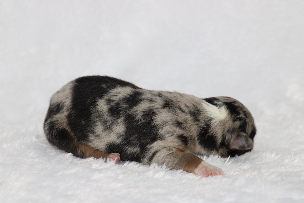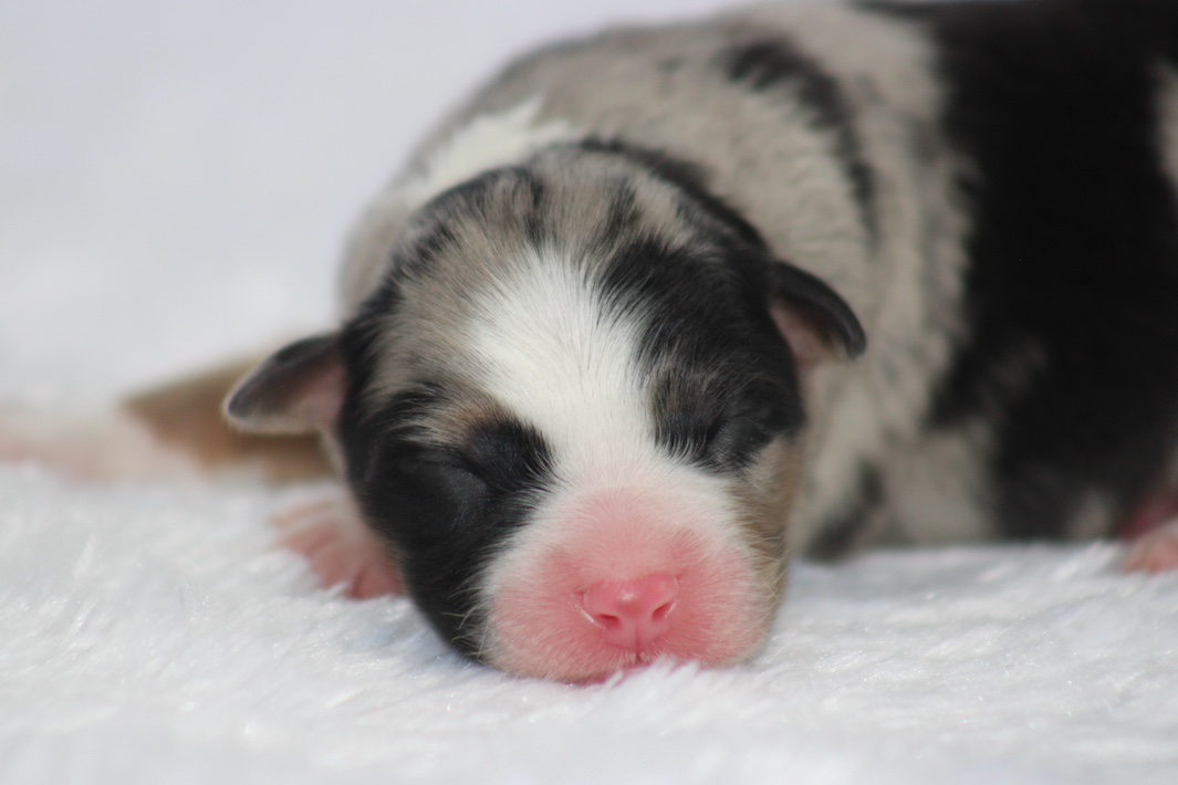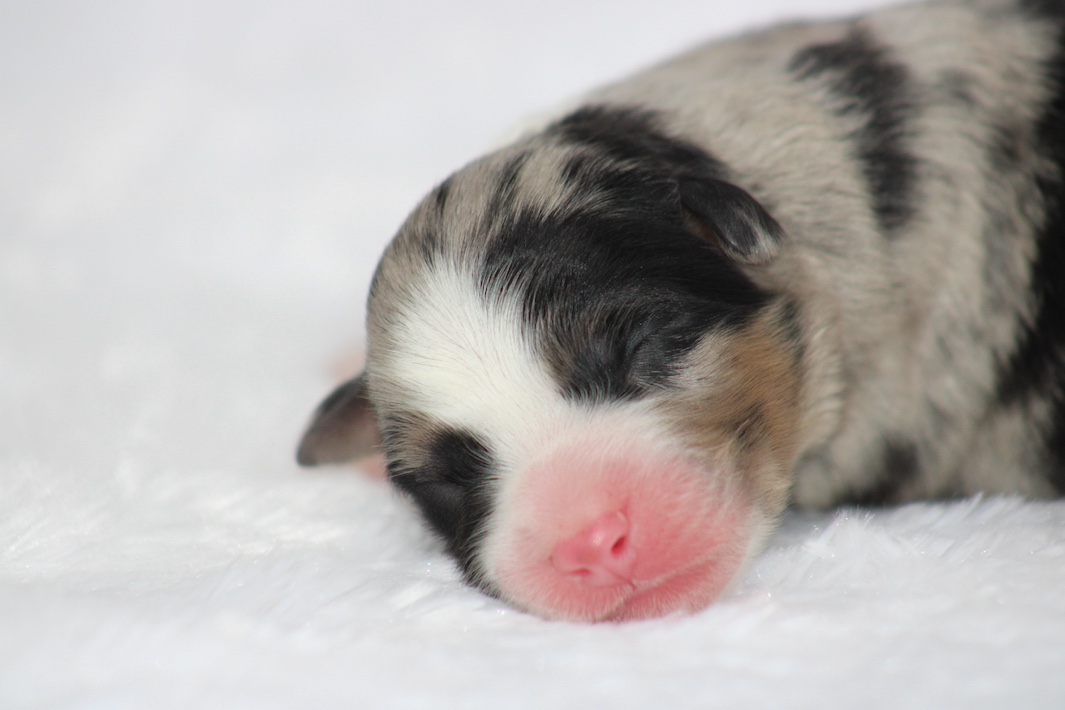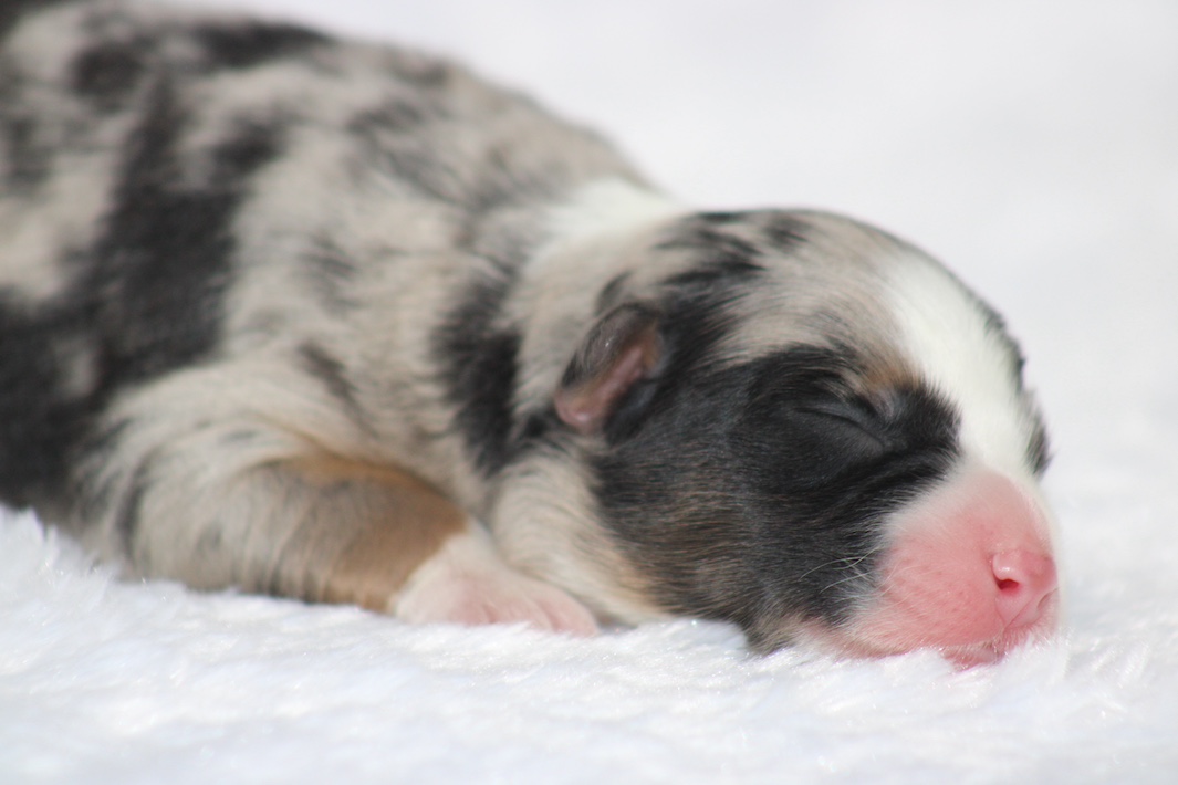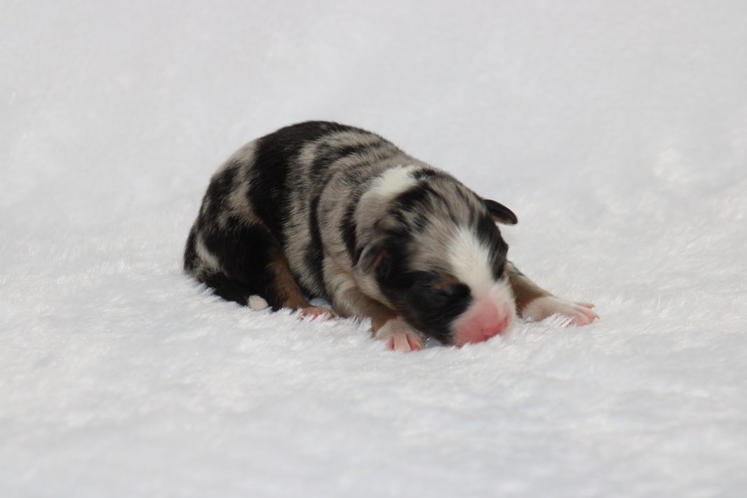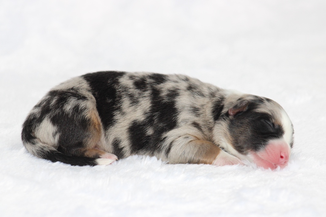 Introducing our biggest litter ever born in 17 years…..WOW is all we can say! 14 puppies. The litter is themes “the new year” . Meet December! This boy is staying here at Canyon Creek for our program because these are just really good genetics and great tempered dogs. Betty had 14 puppies but one was still born. So 13 puppies it is and that is a really BIG job for any dog! So we enlisted the help of Peach. Peach had just weaned her litter of 4 and Betty was definitely going to need some help nursing puppies for a few weeks. Peach is a phenomenal mother and she laid right down, began to lick them and let them nurse. Dogs really are incredible. So Betty has the 8 merles and Peach is fostering the 5 tri colors. As of today 1-4, everyone is thriving. This is the 2nd litter for Betty and Randy, yes those were big litters but not this big. Betty raises fantastic little puppies. Past families have been totally happy with their dogs so we definitely wanted to cross Betty and Randy again.