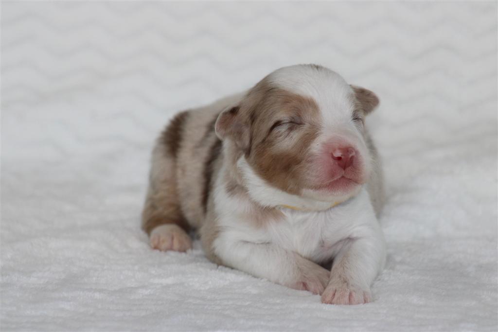Introducing our biggest litter ever born in 17 years…..WOW is all we can say! 14 puppies. The litter is themes “the new year”. March is one of 4 red merle females in the litter. She has a perfectly marked white face, full collar, some dark red spots. Gorgeous girl here. This is another big female! She is estimated to be 50-55 pounds. Betty had 14 puppies but one was still born. So 13 puppies it is and that is a really BIG job for any dog! So we enlisted the help of Peach. Peach had just weaned her litter of 4 and Betty was definitely going to need some help nursing puppies for a few weeks. Peach is a phenomenal mother and she laid right down, began to lick them and let them nurse. Dogs really are incredible. So Betty has the 8 merles and Peach is fostering the 5 tri colors. As of today 1-4, everyone is thriving. This is the 2nd litter for Betty and Randy, yes those were big litters but not this big. Betty raises fantastic little puppies. Past families have been totally happy with their dogs so we definitely wanted to cross Betty and Randy again. We will be holding back the blue merle male December for our program because these are just really good genetics and great tempered dogs.