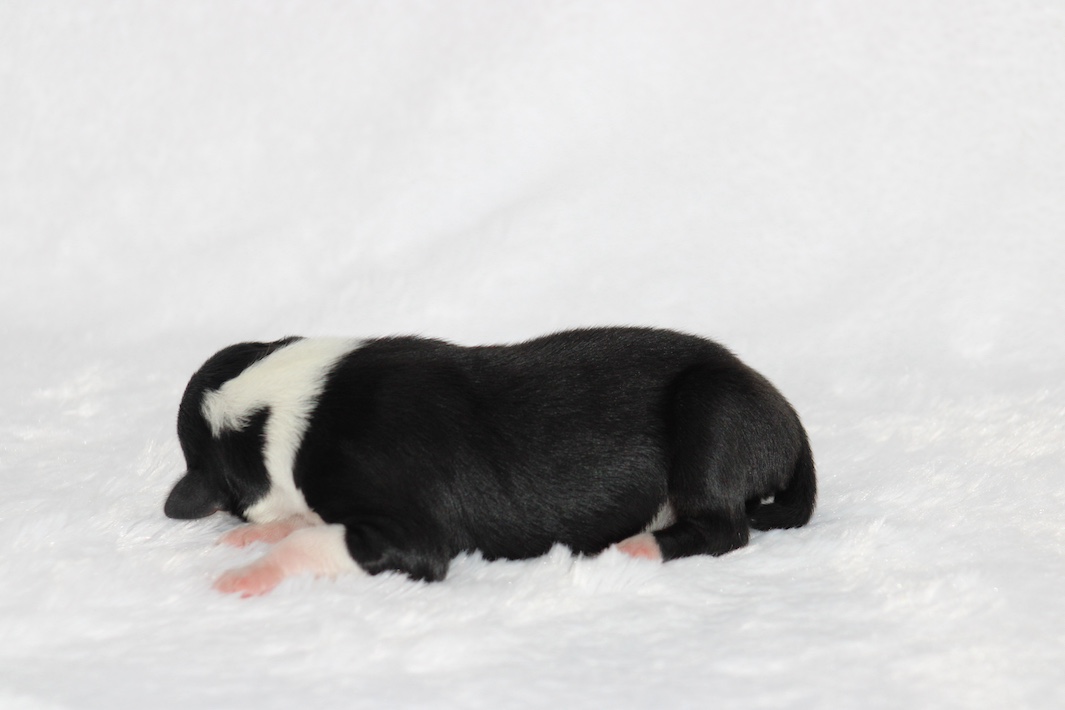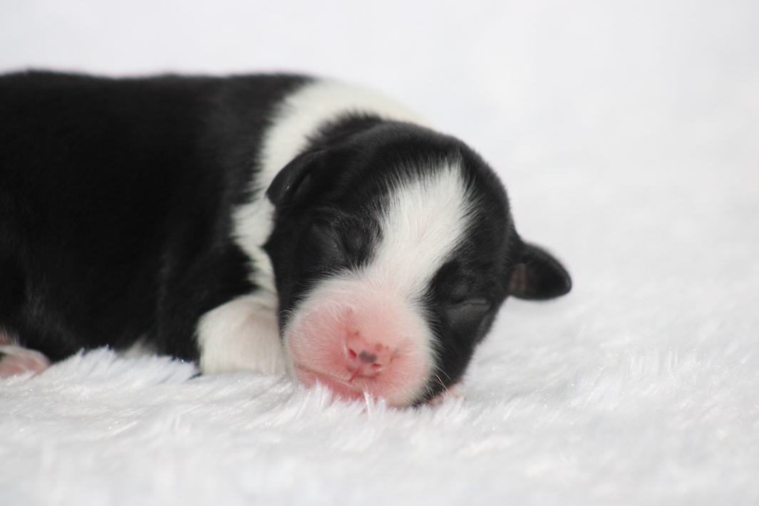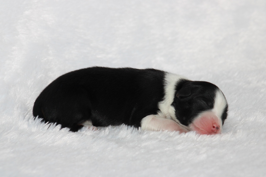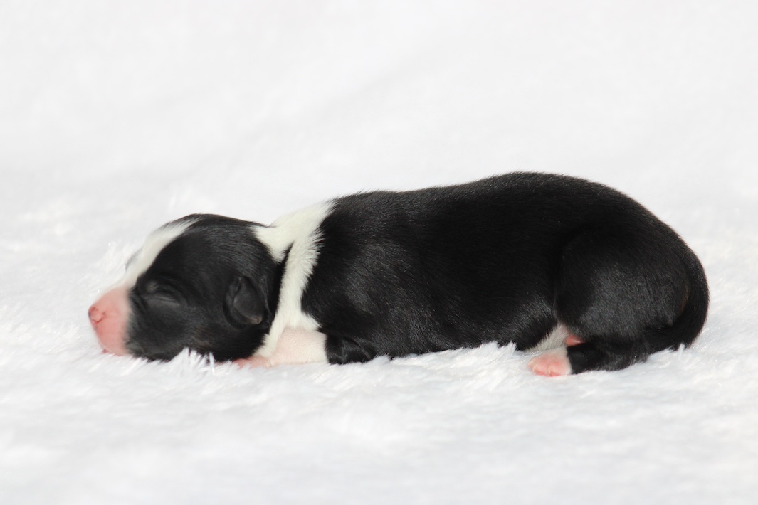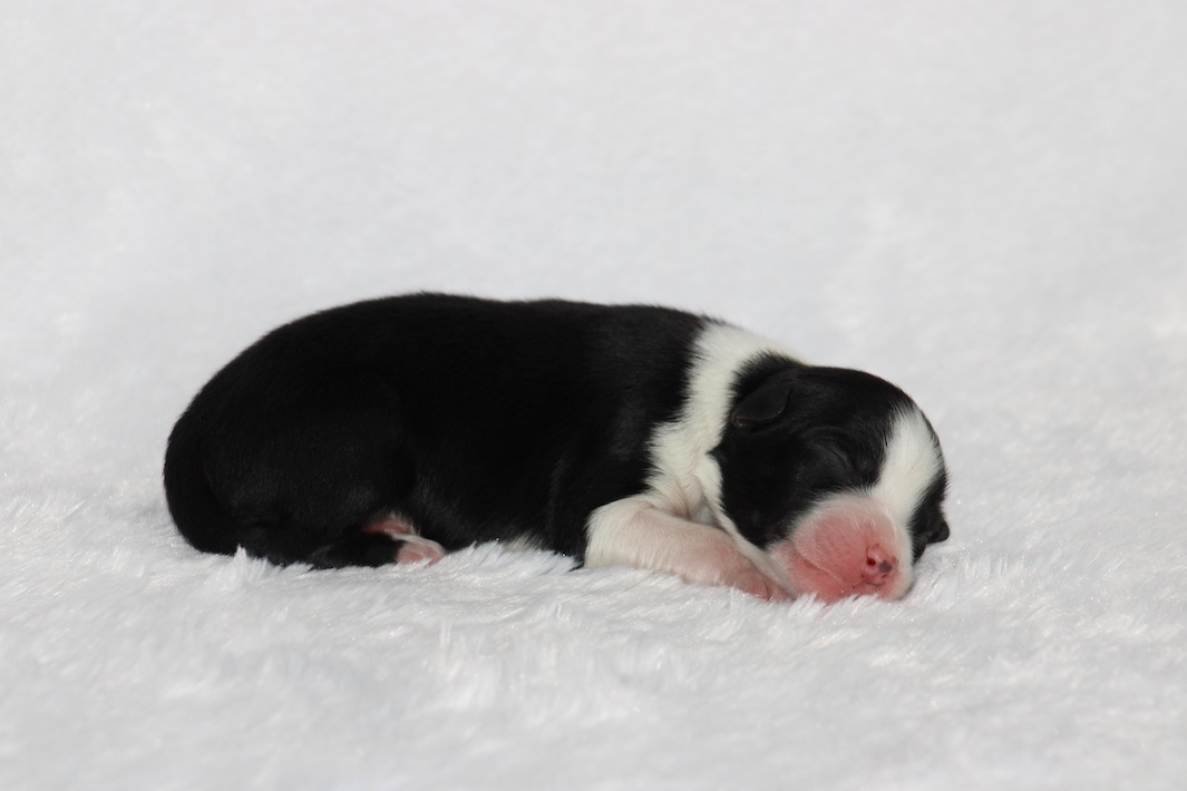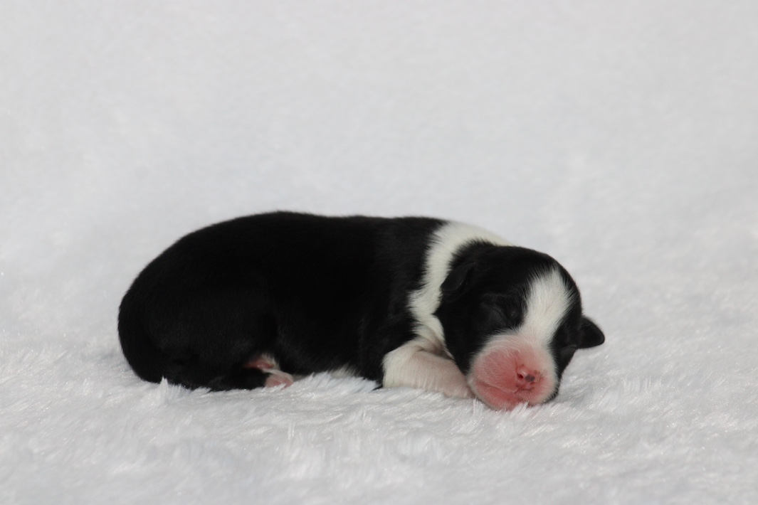 Introducing our biggest litter ever born in 17 years…..WOW is all we can say! 14 puppies. The litter is themes “the new year” . Meet September. If you want a TEXTBOOK black tri, well this is him! This is daddy’s little carbon copy! Look at that blaze face, full white collar and white socks. That copper will just keep developing as he gets older. He is estimated o be 55-60 pounds. Betty had 14 puppies but one was still born.So 13 puppies it is and that is a really BIG job for any dog! So we enlisted the help of Peach. Peach had just weaned her litter of 4 and Betty was definitely going to need some help nursing puppies for a few weeks. Peach is a phenomenal mother and she laid right down, began to lick them and let them nurse. Dogs really are incredible. So Betty has the 8 merles and Peach is fostering the 5 tri colors. As of today 1-4, everyone is thriving. This is the 2nd litter for Betty and Randy, yes those were big litters but not this big. Betty raises fantastic little puppies. Past families have been totally happy with their dogs so we definitely wanted to cross Betty and Randy again. We will be holding back the blue merle male December for our program because these are just really good genetics and great tempered dogs.