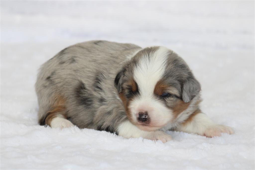 Thank you so much Canyon Creek Aussies for giving us the opportunity to add Lucy to our family. My husband and I fell in love with Aussies 10 years ago and Lucy has fit into our family perfectly. She is so loving, playful, and adores our other two Aussies. One of Lucy's favorite games is to bark and play with our spring doorstops, which can entertain her for quite some time. She is loving the new snow and is even making friends with our chickens. Lucy is getting used to the sound of a snowmobile and loves riding on the 4-wheeler. We've only had her for about 3 weeks, but it definitely feels like she's always belonged with us. Thanks again for such an amazing blue merle puppy! ~ Adams Family -Idaho