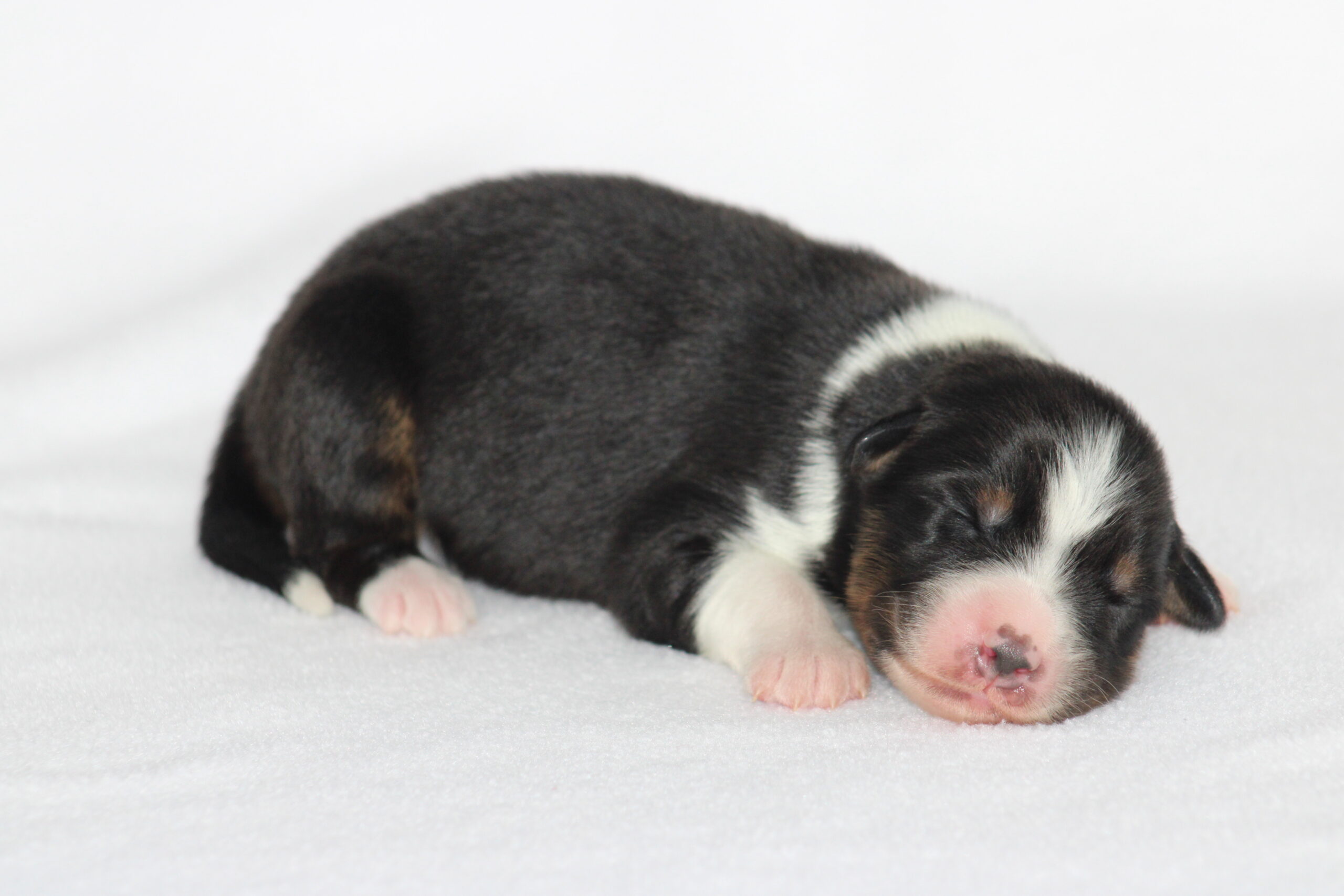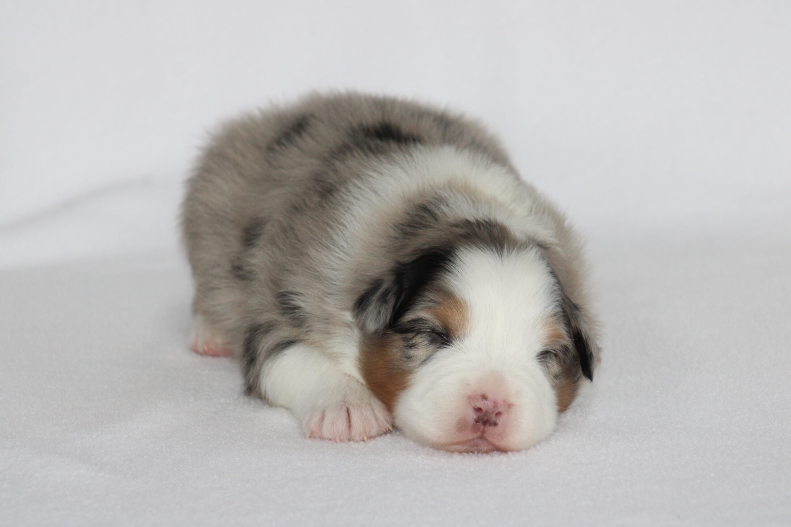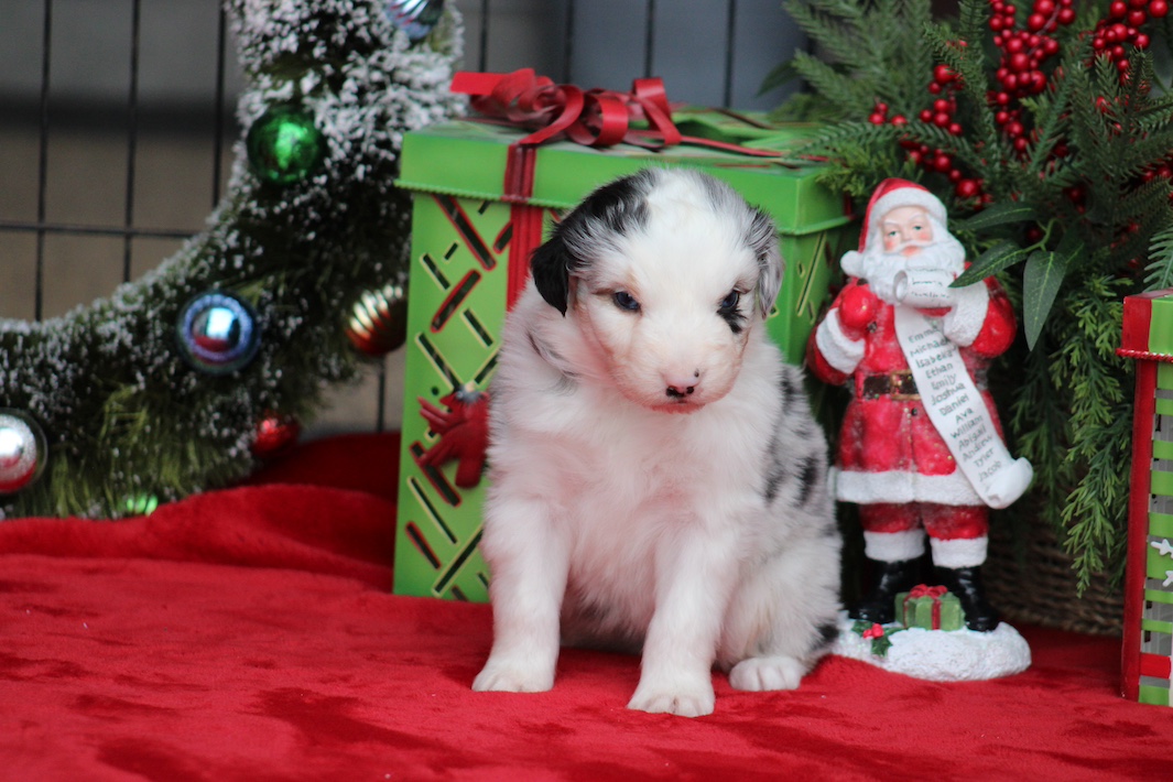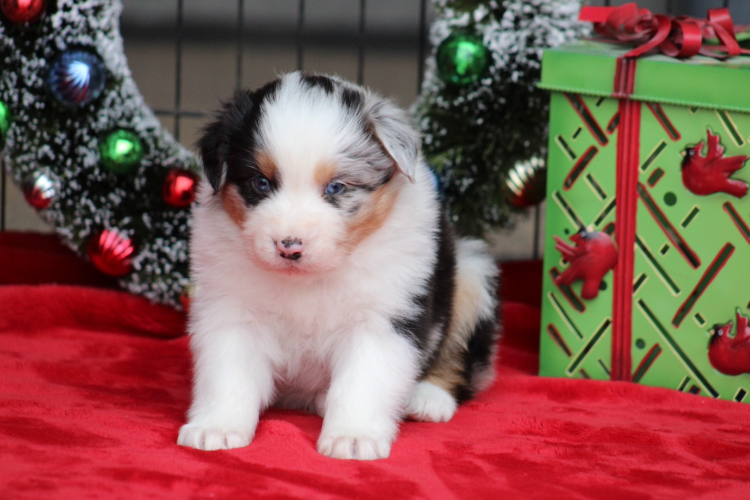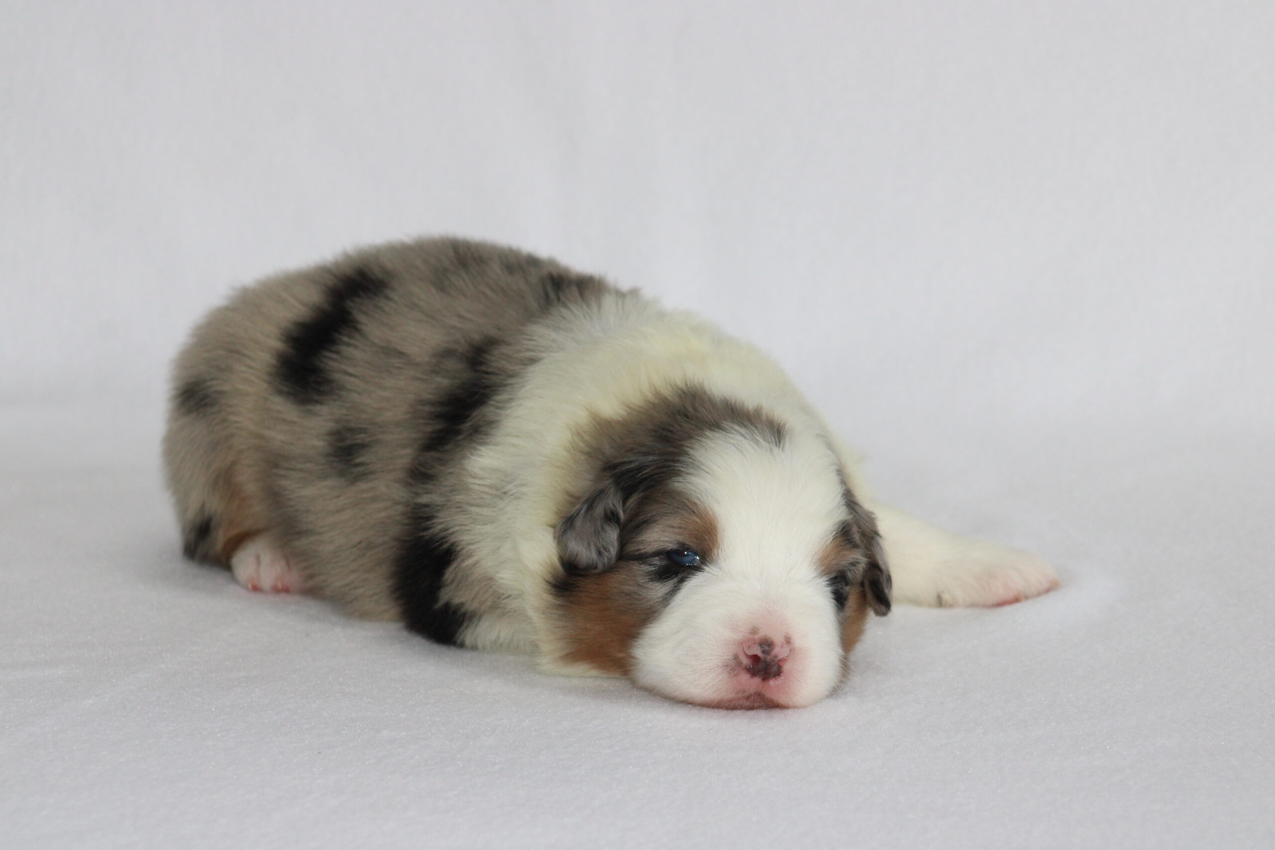 Australian Shepherd BLue Merle Puppy Love at first sight!  Harley greeted us with a big smile and many tail wags to let us know how happy he was to be with us.  Since arriving, he has fit in perfectly with his older brother and sister doggie siblings and his two older human sisters.  He is very, very social with everyone he meets and he was practically potty-trained when we met him.  He has only had a few accidents, otherwise he is very respectful of us and of our property.  I’ve taken him running and hiking and he loves both.  He’s ready for anyone and anything.  I know we are going to enjoy a lifetime of love with Harley.  Thank you so much for all you do to ensure the puppies you raise are loving, smart, healthy and beautiful.