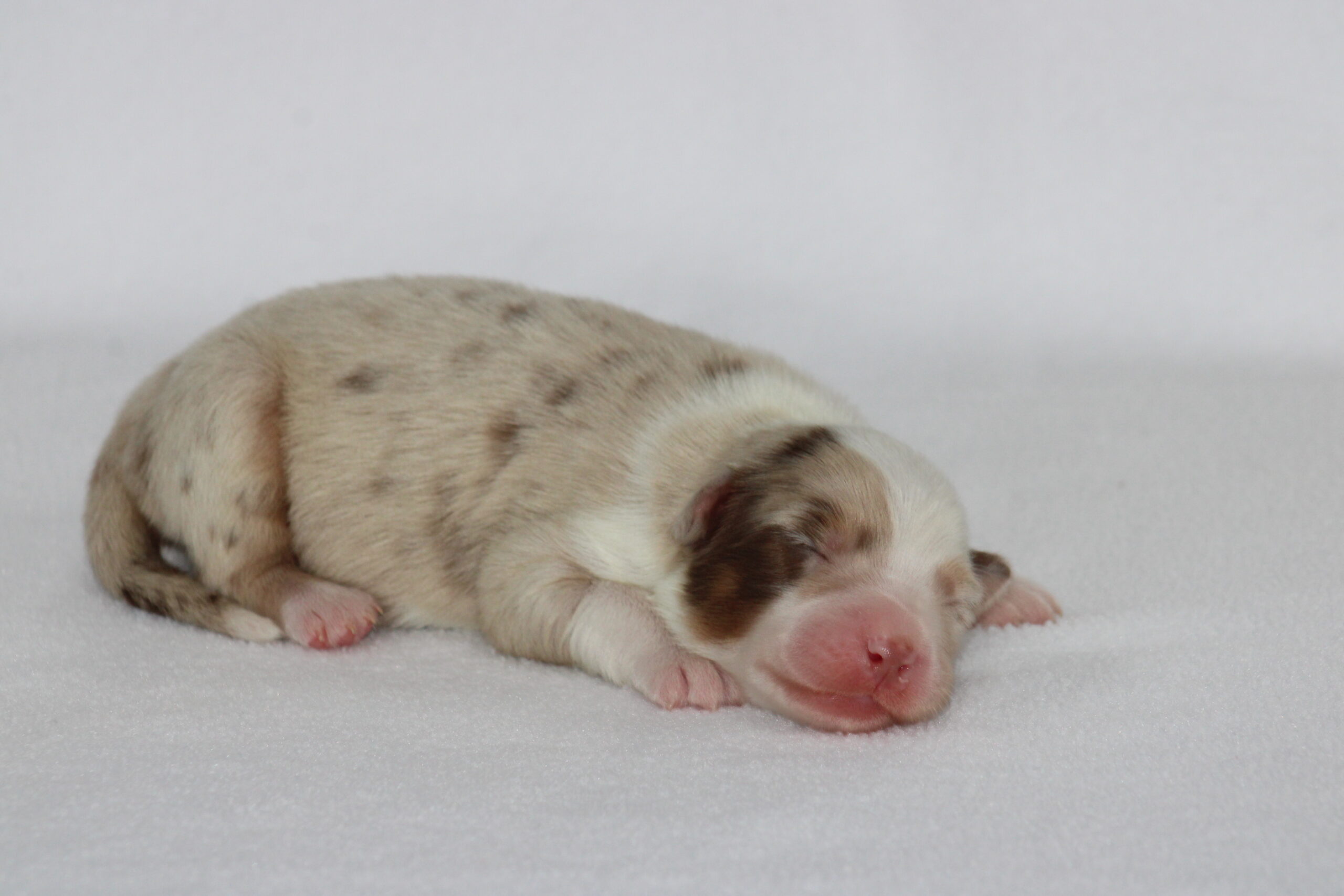 Australian Shepherd Red Merle Female Frankie If ever a little girl was attached to a Red Merle Australian Shepherd, it is Alayna and Frankie.  From the minute she comes to visit, Frankie is by her side.  Frankie is loyal to the end with the grandchildren and has an especially soft spot for a little blonde haired girl that goes by the nickname Laynie Bug.