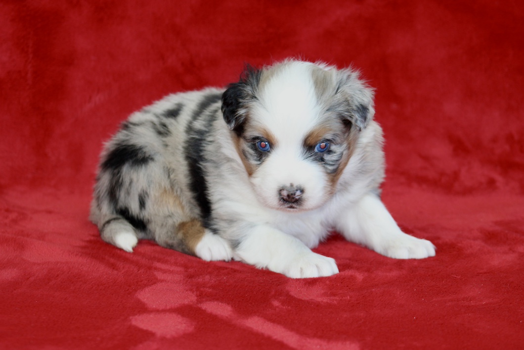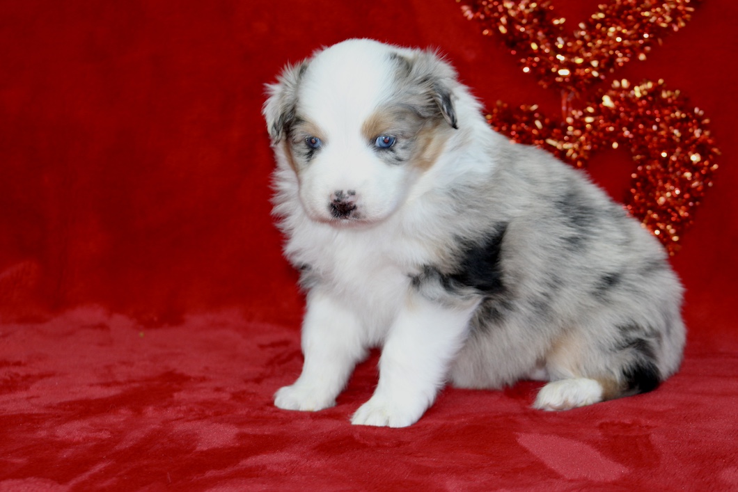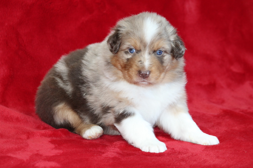 Australian Shepherd BLue Merle Puppy Love at first sight!  Harley greeted us with a big smile and many tail wags to let us know how happy he was to be with us.  Since arriving, he has fit in perfectly with his older brother and sister doggie siblings and his two older human sisters.  He is very, very social with everyone he meets and he was practically potty-trained when we met him.  He has only had a few accidents, otherwise he is very respectful of us and of our property.  I’ve taken him running and hiking and he loves both.  He’s ready for anyone and anything.  I know we are going to enjoy a lifetime of love with Harley.  Thank you so much for all you do to ensure the puppies you raise are loving, smart, healthy and beautiful.