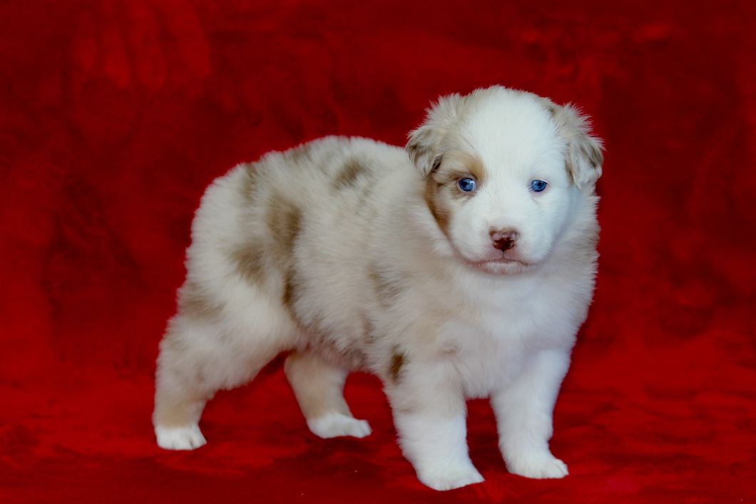Australian Shepherd Red Merle Female Frankie If ever a little girl was attached to a Red Merle Australian Shepherd, it is Alayna and Frankie.  From the minute she comes to visit, Frankie is by her side.  Frankie is loyal to the end with the grandchildren and has an especially soft spot for a little blonde haired girl that goes by the nickname Laynie Bug.